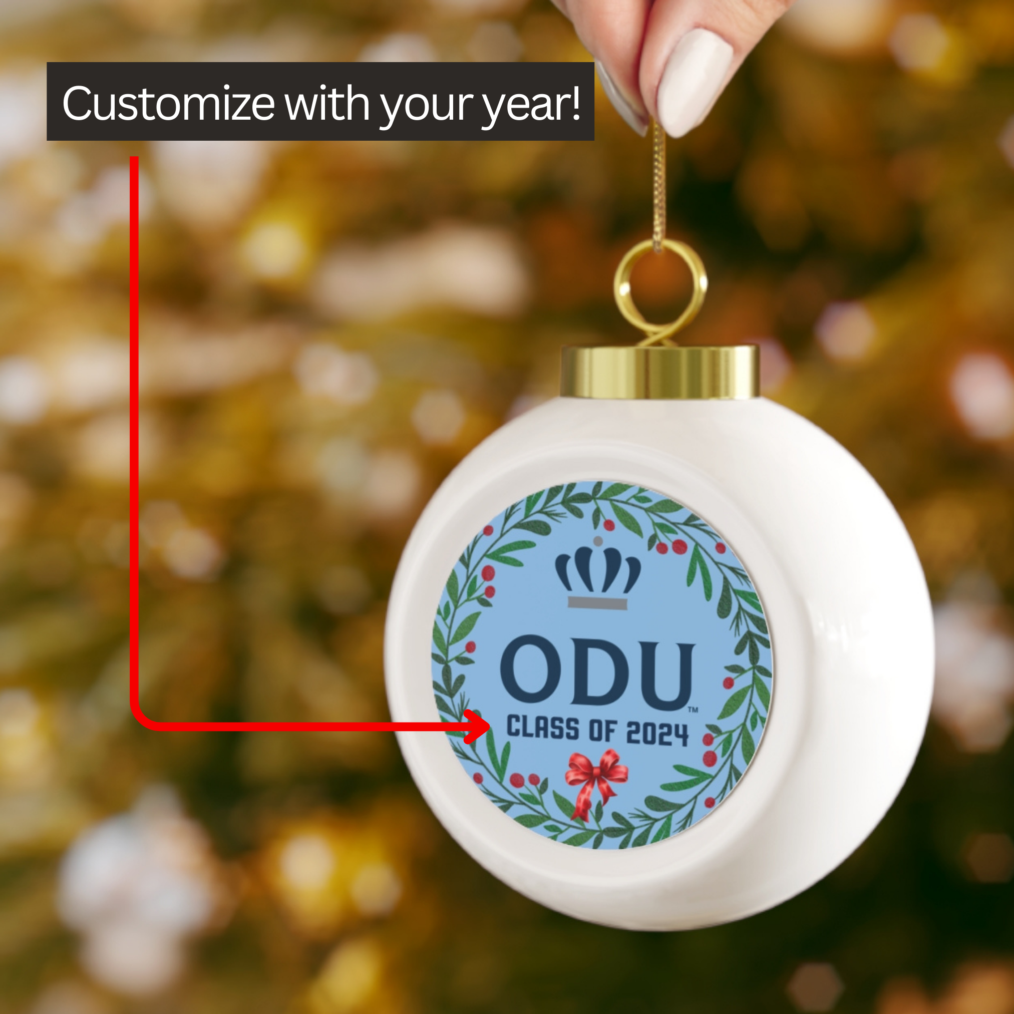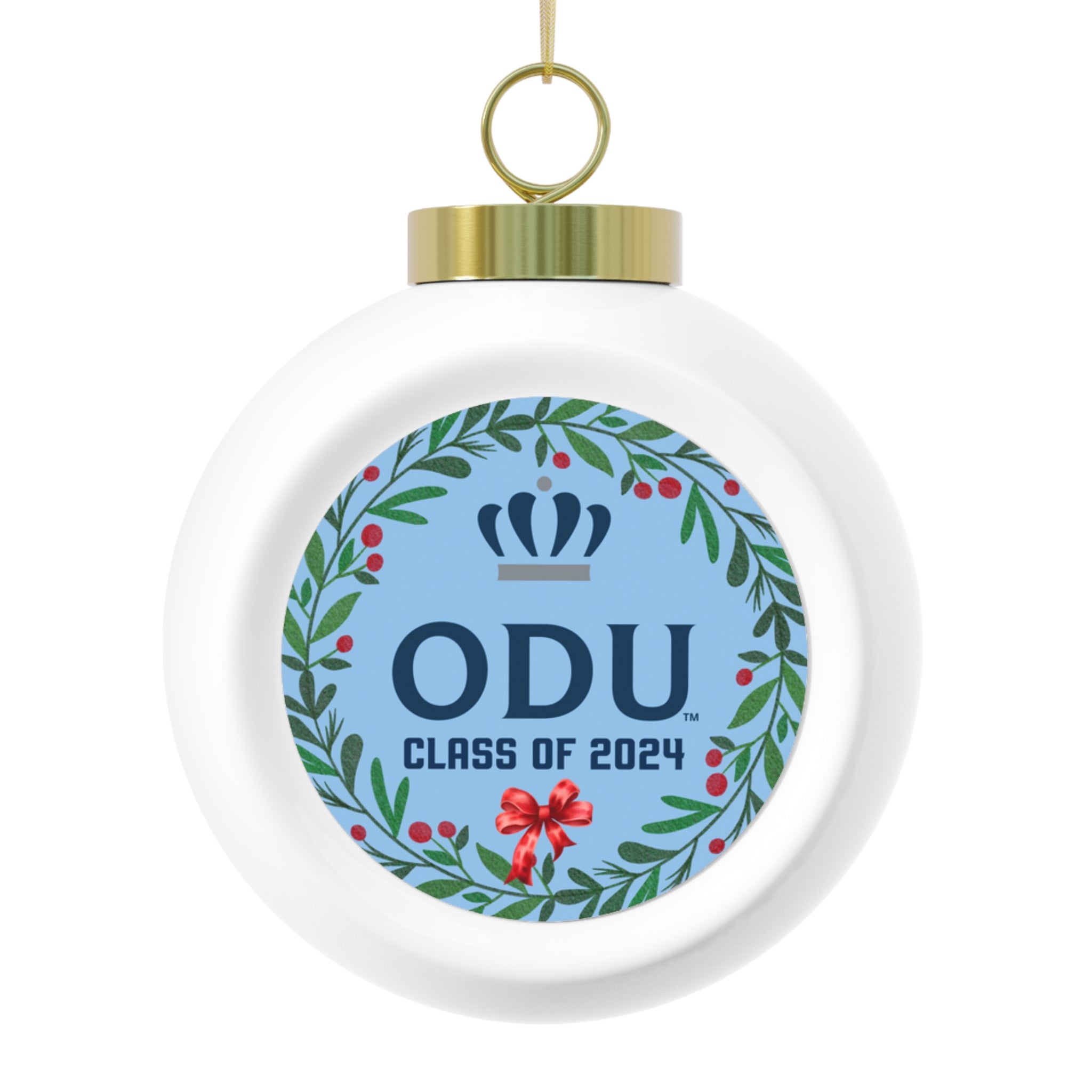 Celebrate your love for Old Dominion University with this customizable wreath ball ornament! Featuring the institutional mark logo and your chosen year, this ornament is perfect for showing off your school pride. Hang it on your tree or give it as a gift to an ODU fan. Go Monarchs!