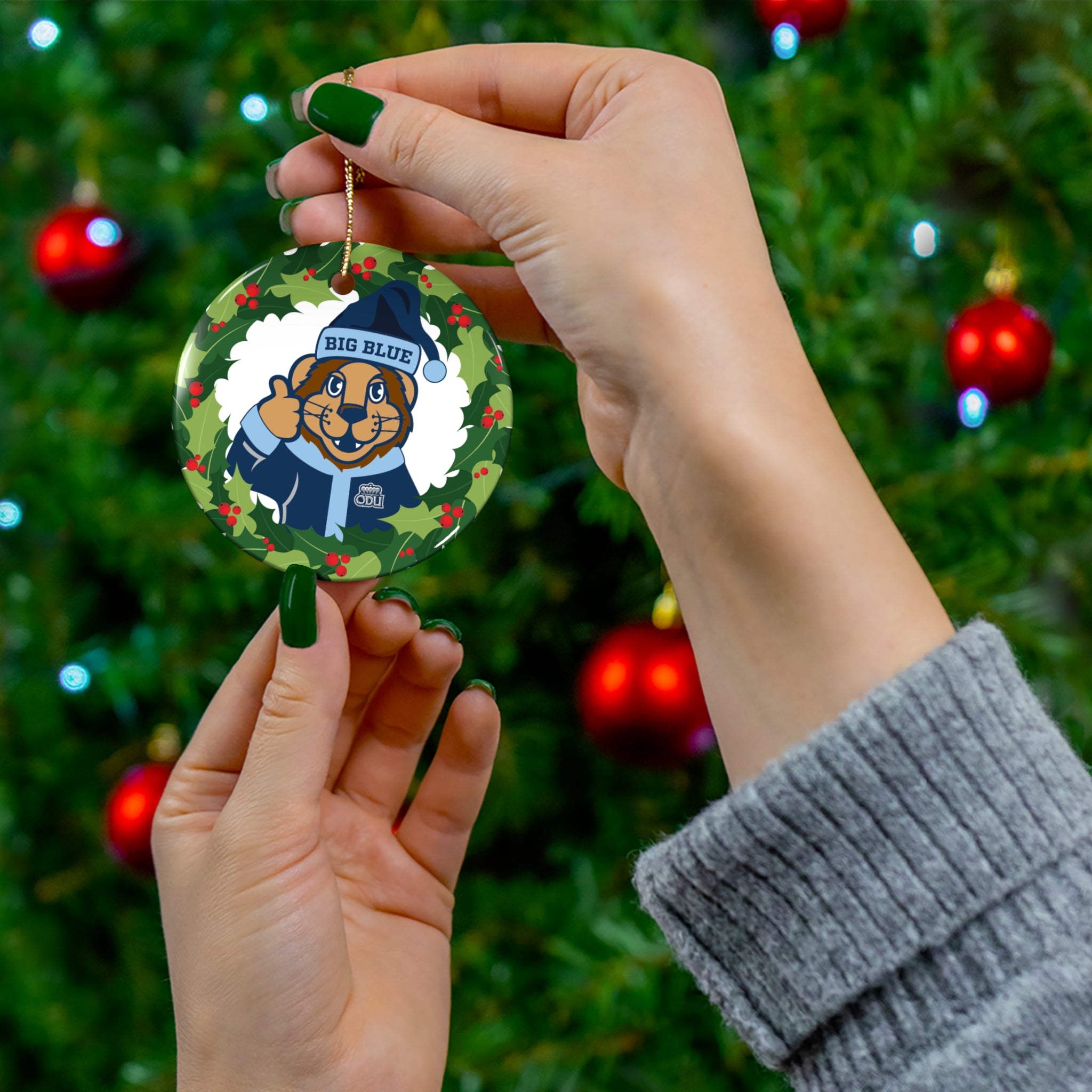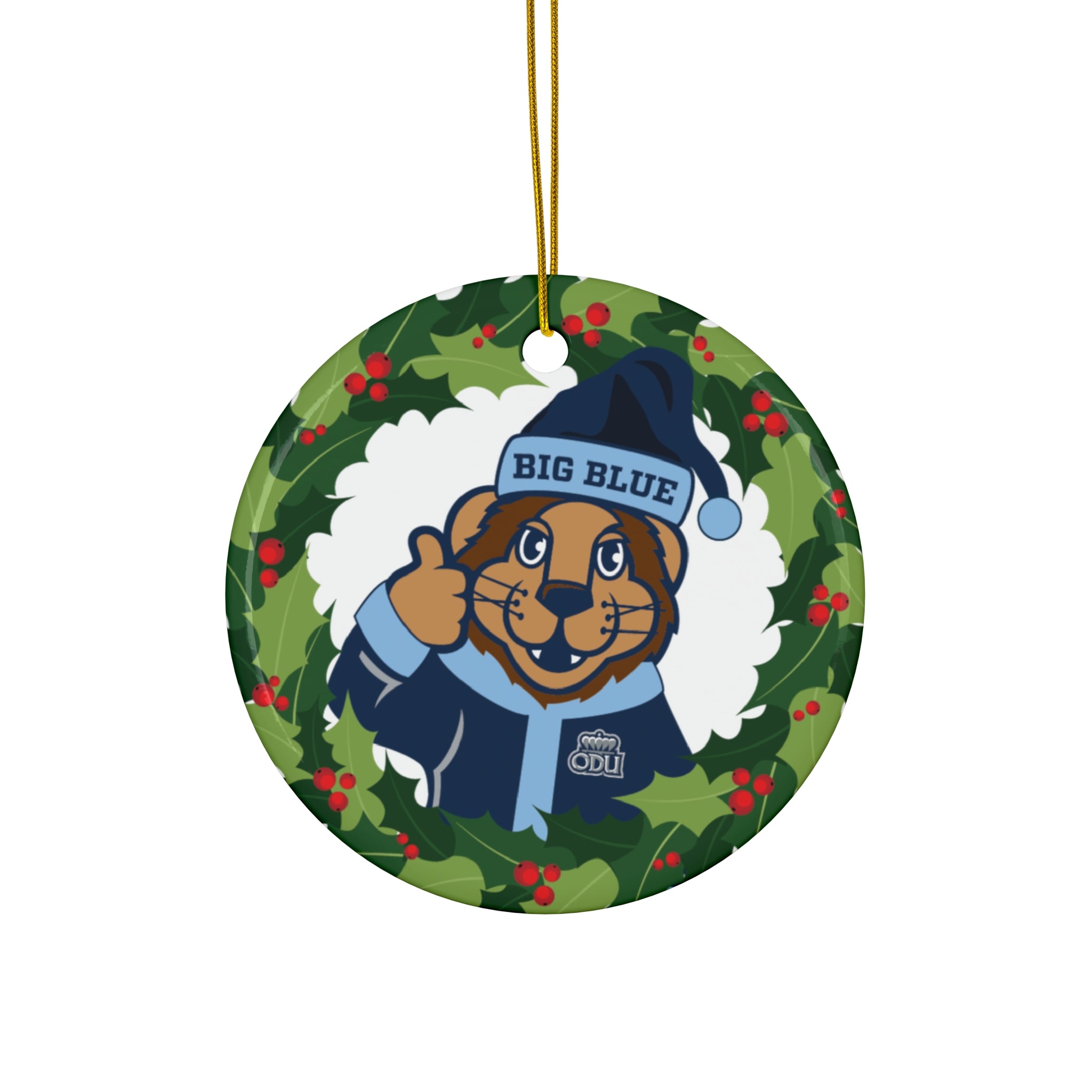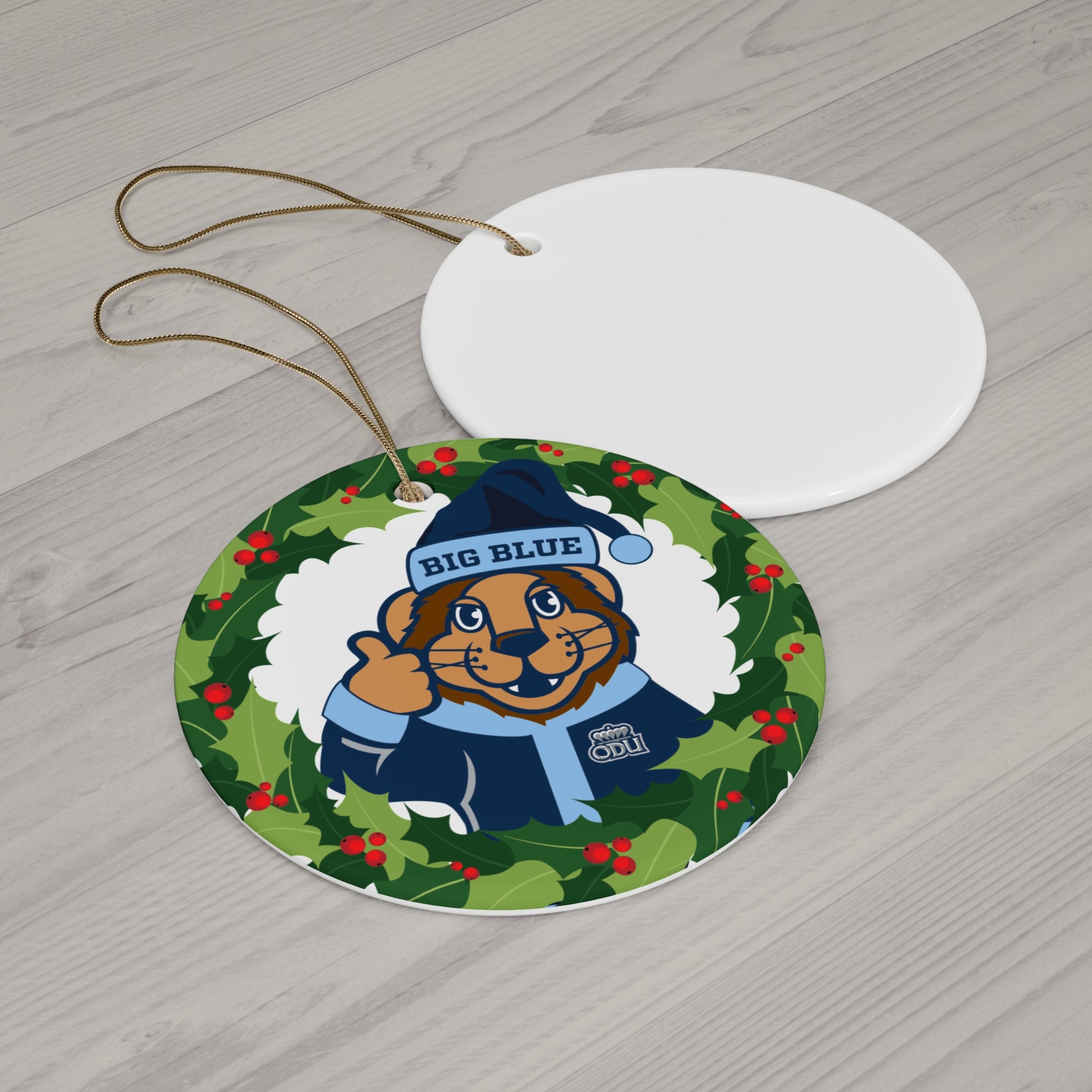 Spread holiday cheer with our Old Dominion University, Big Blue ceramic ornament! This festive circle-shaped decoration features an adorable Santa hat on our lovable mascot, making it the perfect addition to any tree. Go Monarchs!
